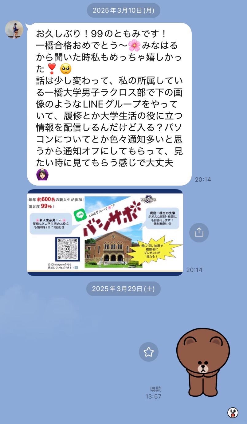 3月、合格と同時に高校同期から様々な勧誘が来ました。もちろんその中には当然サーペンツからのLINEもありました。しかし私は大学で体育会に入る気など微塵もなく、高校時代にやっていた軽音かバレーのサークルに入って好きなだけワクワクすることをして過ごそうと考えていました。そのため軒並み勧誘LINEはシャットして過ごしていました。